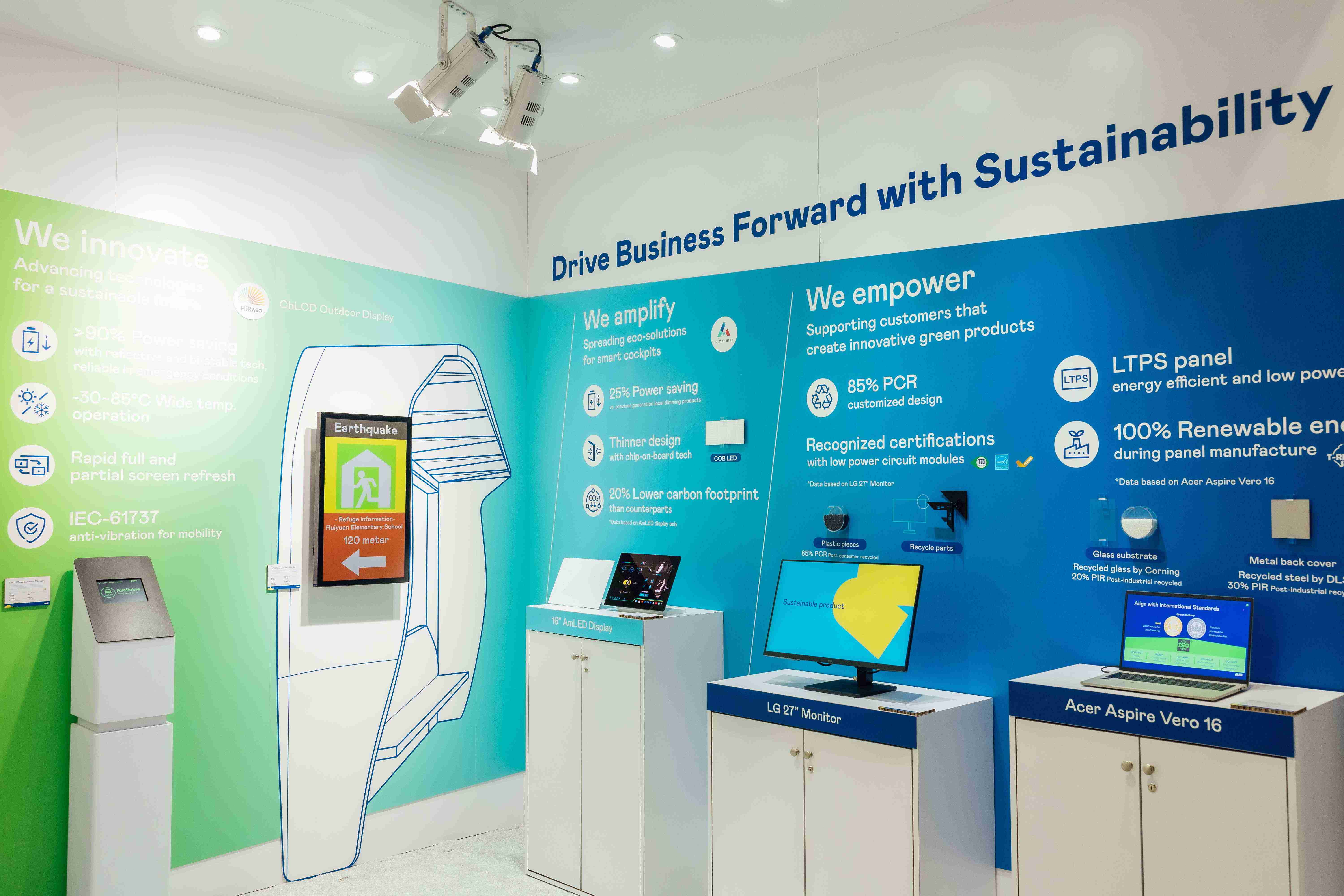 尊龙z6运用创新显示技术HiRaso胆固醇液晶双稳态技术达到显示零耗能、、、扩大节能省电的AmLED显示技术应用于车用产品、、以再生的消费后回收(PCR)塑料及全绿电生产之面板,,,应用于笔电及萤幕,,,,增加绿色价值。。。。