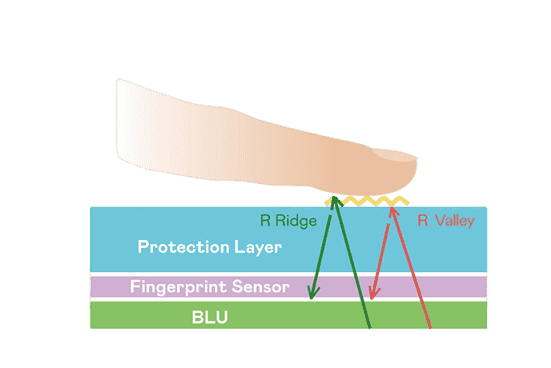 TFT 指纹扫描感测技术利用薄膜电晶体 (TFT) 当作光感测元件,,,藉由非晶硅 (a-Si) 与低温多晶硅(LTPS)既有光电转换特性对不同波段光源进行吸收,,,,使感测 IC 读取阵列感测元件的光漏电差异,,,转换成数位灰阶影像。。。